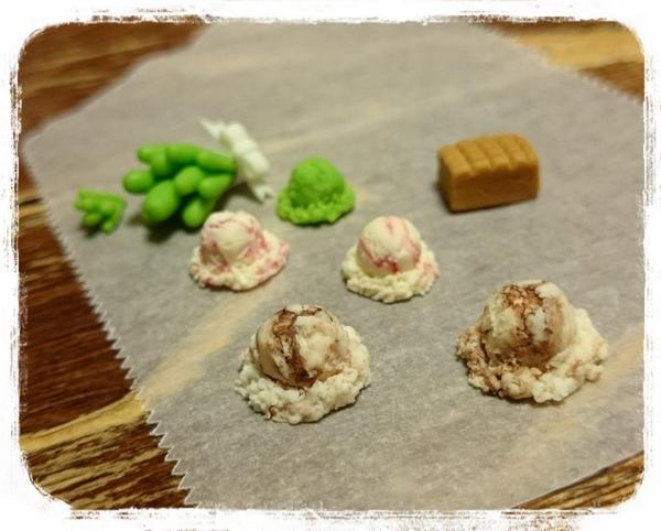 アイスクリームを久々に作ったのと、ちょっと失敗した粘土でキャラメルもどき。